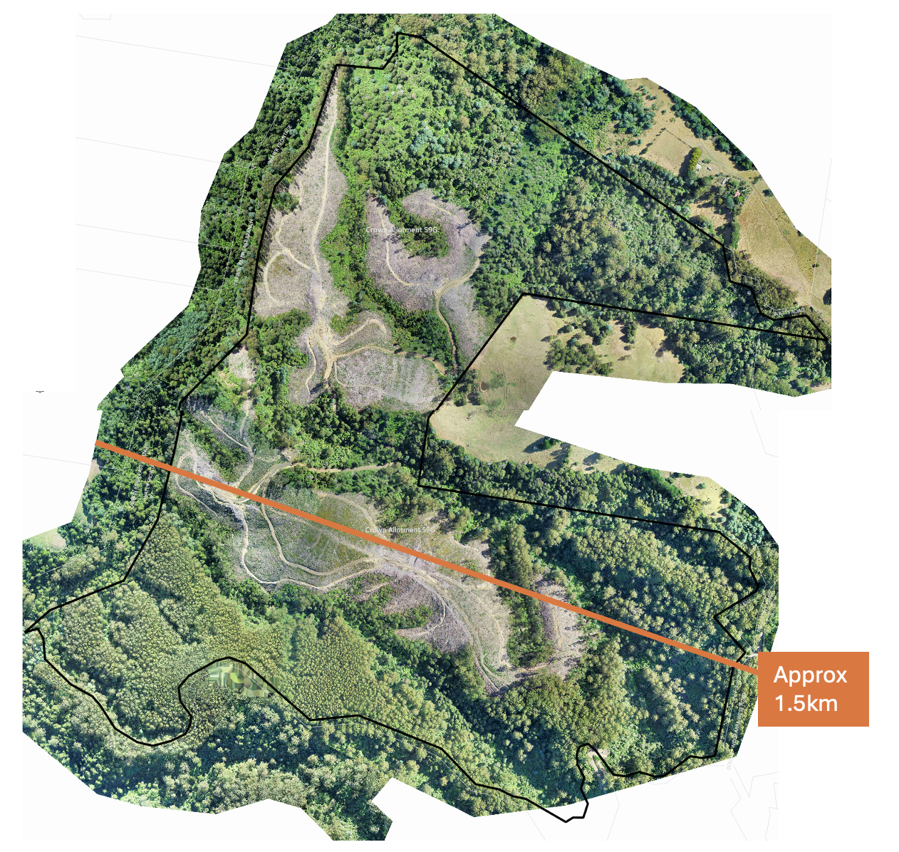 This is what it looks like after the logging stopped. This image was taken in mid 2025 when over 50 hectares had already been logged, with another 19 hectares in the south section that you can see have not yet been logged. We have shown an approximate distance across the coupe so you get an idea of the size - it's big.
